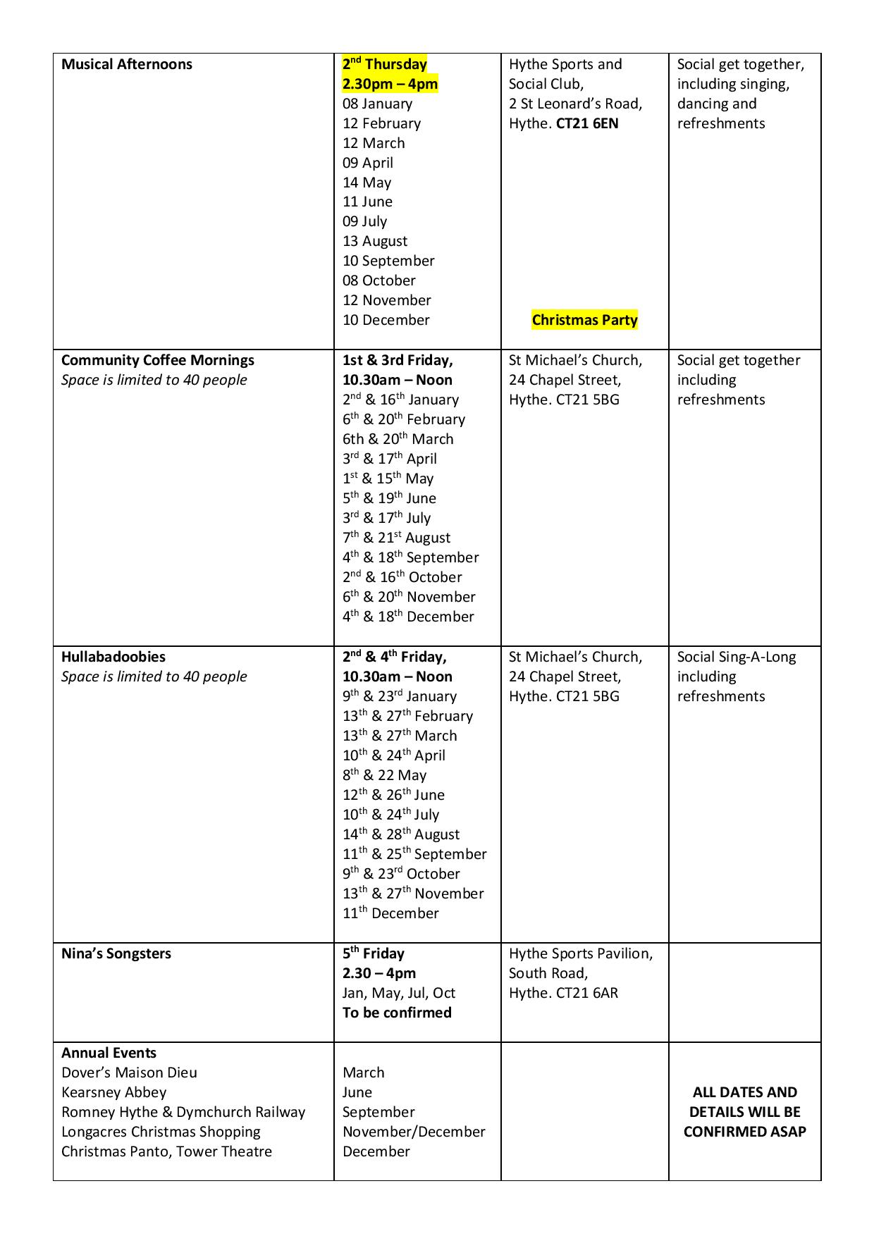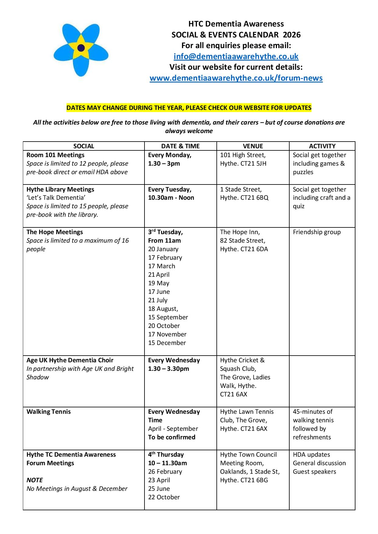 Hythe Dementia Awareness - Social & Events Calendar 2025 and 2026