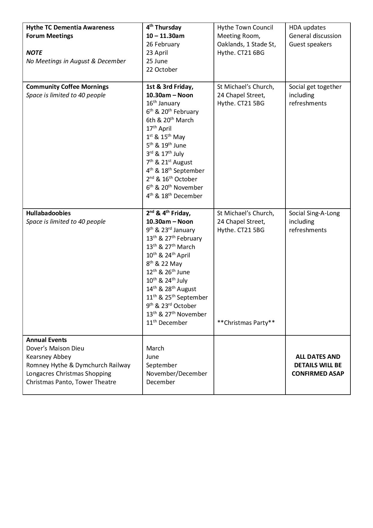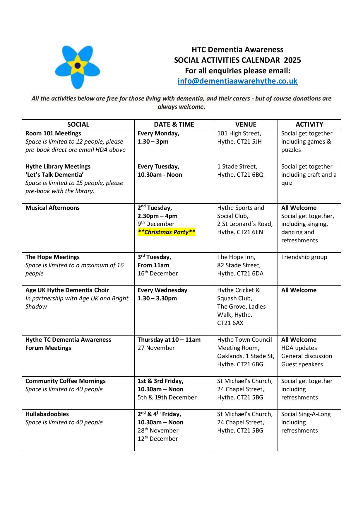 Hythe Dementia Awareness - Social & Events Calendar 2025. Scroll down for 2026 Calendar